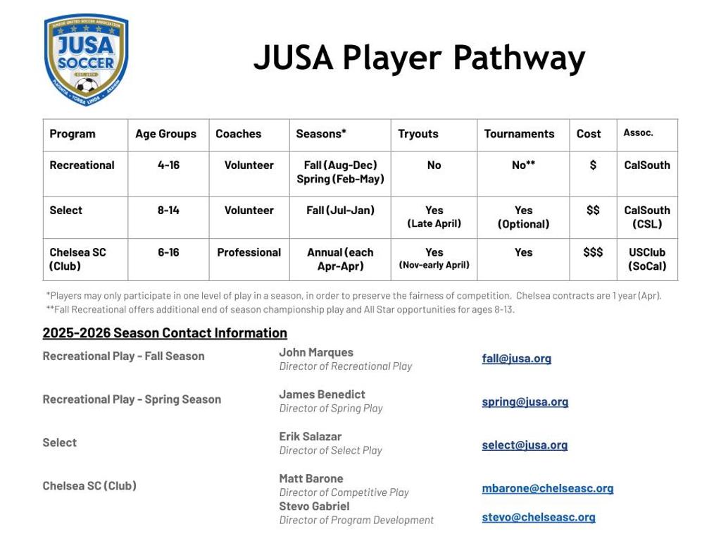Everyone that signs up each season at the Recreational level will be placed on a team in the area that they live*. Select and Competitive levels have tryouts, and players are selected by coaches by skill levels. Contact each program at the email addresses above.